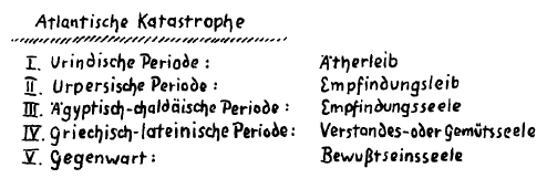 Wenn wir die aufeinanderfolgenden Epochen der Erdenentwikkelung nach der großen atlantischen Katastrophe ins Auge fassen, so ist es ja so: Wir haben also, wenn wir zurückgehen in das 8., 9. Jahrtausend, die atlantische Katastrophe, die ich öfter geschildert habe. Wir haben dann die erste nachatlantische Kulturperiode, über die Sie nachlesen können in meiner «Geheimwissenschaft im Umriß», die ich die urindische genannt habe (siehe Schema). In dieser urindischen Periode lebt der Mensch vorzugsweise in seinem Ätherleib oder Bildekräfteleib. Da ist noch die Verbindung eine so intensive, daß man überhaupt sagen kann: Der Mensch lebt in seinem Ätherleib oder Bildekräfteleib. Er lebt so, daß im Grunde genommen der physische Leib für ihn mehr noch ein Kleid ist, etwas Äußerliches ist. Er sieht viel mehr mit seinem ätherischen Auge in die Welt hinaus als mit den physischen Augen. Die zweite Periode ist die urpersische. Da sieht der Mensch in seine Umwelt vorzugsweise durch dasjenige, was man nennen kann den Empfindungsleib. In der dritten, in der ägyptisch-chaldäischen Periode sieht der Mensch in die Welt mit Hilfe seiner Empfindungsseele. Endlich in der vierten, in der griechisch-lateinischen Zeit, sieht der Mensch in die Welt mit der Verstandes- oder Gemütsseele.