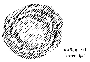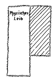 Nun machen wir uns aber klar, wie das nun eigentlich ist. Es ist das sogar sehr schwer, aber wenn man diesen Tatbestand schematisch aufzeichnen wollte, so müßte man sagen: Physischer Leib (siehe Schema), Ätherleib (schraffiert), und in diesem Ätherleib macht sich zunächst das Seelische geltend, aber so, daß zuerst der Mensch überhaupt im Ätherleib noch lebt. Dann aber im Empfindungsleib, der in Wirklichkeit noch ganz Ätherleib ist. Denn erst in der ägyptisch-chaldäischen Zeit lebt der Mensch in der Seele, aber da lebt die Seele durchaus noch im Ätherleibe drinnen. So daß ich etwa die Seele so zeichnen könnte (rot schraffiert). Indem der Mensch sich seelisch innerlich fühlt, fühlt er sich noch zur Hälfte im Ätherleib drinnen.