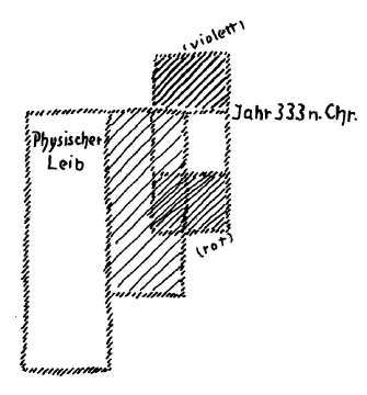 In der griechisch-lateinischen Zeit ist es so, daß der Mensch herauswächst mit seinem Seelischen aus dem Ätherleib. Er hat auch noch den Ätherleib in sich etwa bis zum Jahre 333. Dann wächst der Mensch so heraus aus dem Ätherleib, daß seine Seele nur ganz lose mit dem Ätherleib verbunden ist, gar nicht mehr eine innere Verbindung hat (violett schraffiert). Die Seele fühlt sich nach außen hin verlassen. Sie ist genötigt jetzt, ohne die Stütze des Ätherleibes hinauszugehen in die Welt. Dadurch entsteht die Not nach Christus. Denn jetzt, da man nicht mehr in der Seele innig verbunden ist mit dem Ätherleib, sieht man nichts mehr vorn Sonnengeist, nicht einmal das Nachbild, wenn man in die Himmel hinausschaut. Aber in der Weltenentwickelung ist alles so, daß es sich erst durch lange Zeitlagen allmählich entwickelt. Zunächst war vom 4. Jahrhundert ab die Seele gewissermaßen innerlich emanzipiert vom Ätherleib, aber sie war noch nicht in sich erstarkt, sie war noch in sich schwach. Und wenn wir die ganzen Jahrhunderte durchgehen, vom 5., 6., 7. Jahrhundert bis ins 14., 15., 16. Jahrhundert, ja bis in unsere Zeit — aber namentlich wollen wir zunächst bei der Periode bis ins 15. Jahrhundert bleiben —, so haben wir die innerlich eben emanzipierte, aber schwache Seele, die zwar die Not nach etwas fühlt, aber noch nicht stark genug ist, aus innerem Impuls heraus dieser Not entgegenzukommen und, statt wie früher den Christus in der Sonne, jetzt den Christus im Mysterium von Golgatha zu suchen; statt ihn im Raume draußen, ihn im Zeitenlaufe zu suchen. Die Seele mußte innerlich erstarken, um in sich überhaupt Kräfte auszubilden. Die ganzen Jahrhunderte bis ins 15. Jahrhundert herein war man nicht stark genug, um innerlich Kräfte auszubilden, um überhaupt zu einer Erkenntnis von der Welt durch die Seele zu kommen. Daher beschränkte man sich darauf, die Erkenntnisse aus den Büchern zu nehmen, welche die Alten hinterlassen hatten, das historisch Bewahrte als Erkenntnis zu nehmen.