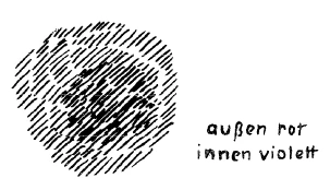 If we imagine this not schematically, but actually very real, it is like this: through physical vision the sun is seen (light shaded), through vision with the etheric body behind the sun the sun spirit, the Christ (old time, red). Today it is the case that when man looks into himself, he has that ego. He feels the I, he has an I-feeling. But that is very dark. This sense of self first arose in the emancipated soul. Formerly man looked out into the world, now he must look into himself. Looking out into the world brought him together with the sun and with Christ. Looking inwards initially only brought him together with the ego. He must now come to find behind the ego that which he previously found in front of the sun. He must come to feel that which he experienced in the light, which he experienced from sunrise to sunset, the Christ, the illuminator of his own knowledge, shining inwardly out of his ego, so that he finds in the Christ the strong support of his own ego. So that one can say: Formerly one looked out into the sun and found the light shining through. Now one feels into oneself and learns to recognize the through-characterized I (red, violet).