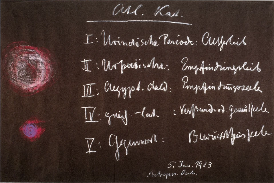 If we look at the successive epochs of the earth's development after the great Atlantean catastrophe, it is like this: If we go back to the 8th, 9th millennium, we have the Atlantean catastrophe, which I have described several times. We then have the first post-Atlantean cultural period, which you can read about in my “Secret Science in Outline”, which I have called the primeval Indian period (see diagram). In this primeval Indian period man lives preferably in his etheric body or body of formative forces. Here the connection is still so intense that one can even say: Man lives in his etheric body or body of formative forces. He lives in such a way that basically the physical body is more of a garment for him, something external. He looks out into the world much more with his etheric eyes than with his physical eyes. The second period is the primordial period. Here man sees into his environment preferably through what may be called the sensory body. In the third, in the Egyptian-Chaldean period, man sees into the world with the help of his sentient soul. Finally, in the fourth, in the Greco-Latin period, man looks into the world with the help of the intellectual or emotional soul.