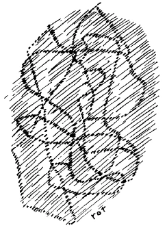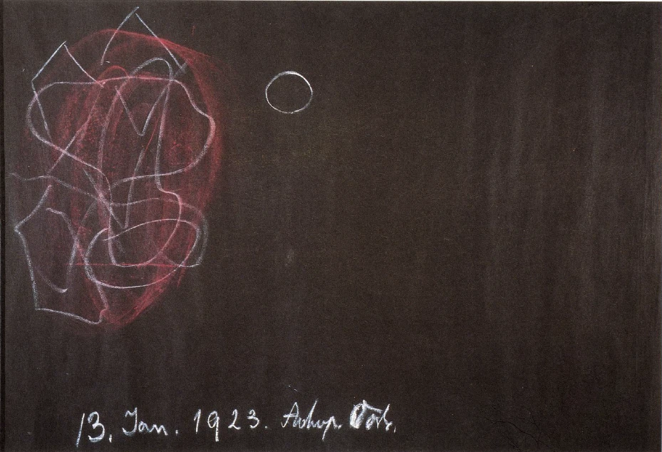 Now those beings with whom the old wise man could enter into real relationships did not merely point him to his life water, out of which this microcosm was born, but to his life air, to that which man takes in as air with his breath and spreads throughout his whole organism. What is spread out there in turn pours out over this entire microcosm, so to speak, making the figures inside indistinct (red hatching on the drawing). The wonderfully ethereal little world begins, as the breath comes over it, here and there, one might say, to fade away, to become indistinct. That which was multiform becomes one, because the astral man lives in the aeriform, just as the etheric man lives in the watery. The astral man lives in it, and through the collapse of the etheric thoughts, through the transformation of the etheric thoughts into power, through the astral in the aerial man, the will is born, and with the will the forces of growth, which are related to the will.