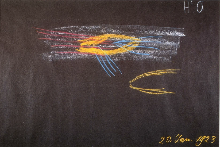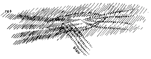 Indem mir der Fisch sozusagen entgegenschwimmt, er seine Zähne, wenn ich mich so ausdrücken darf, entgegenträgt, aber dieses durchleuchtet-durchwärmte Wasser die weiche Fischkörpersubstanz mit dem Atmungsrhythmus über die Kiefer hinüberlegt, indem der Fisch mit der eigentümlichen Art seiner Kopfbildung mir entgegenhält seine überzogenen Kiefer, fühle ich, wie mir mit diesem Fische das durchleuchtete und durchwärmte Wasser entgegenkommt. Und ich fühle dann, wie auf der andern Seite in der Flossenbildung (blau) etwas anderes tätig ist. Ich lerne dadurch - ich will das heute nur andeuten — allmählich fühlen, wie da in der Schwanzflosse, in den andern Flossen das abgeschwächte Licht ist, das so abgeschwächte Licht, daß es nicht mehr die Körpersubstanz bezwingt zum Weichwerden, wie es da verhärtend wirkt. Ich lerne so allmählich in dem, was mir der Fisch entgegenbringt, in seinem Haupte das Sonnenhafte kennen, ich lerne so in den verhärteten Flossenbildungen das Mondartige erkennen, wie es zurückstrahlt, kurz, ich werde imstande sein, den Fisch hineinzustellen in das ganze Wasserelement.