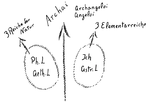 Schematisch kann man das so zeichnen: Physischer Leib, Ätherleib müssen im wachenden Zustande ein richtiges Verhältnis gewinnen zu den drei Reichen der Natur (siehe Zeichnung). Der schlafende Mensch, Ich und astralischer Leib müssen ein richtiges Verhältnis gewinnen zu den drei Elementarreichen, aber auch zu den Reichen der Angeloi und Archangeloi. Aber hat man nur zu diesen Reichen ein entsprechendes Verhältnis, so kommt das richtige Ineinander nicht zustande. Es ist kein richtiges Verhältnis zwischen Schlafen und Wachen. Damit in der richtigen Weise das Ich und der astralische Leib aus dem physischen und dem AÄtherleib herauskommen und hereinkommen, muß der Mensch außerdem noch das rechte Verhältnis haben zu dem Reiche der Archai (mittlerer Pfeil), zu dem Reiche der Urbeginne oder Urkräfte.