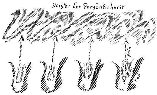 Das ist im Laufe der Menschheitsentwickelung anders geworden. Wir haben hier das Meer der kosmischen Gedanken (siehe Zeichnung, gelb), die Verwaltung ist übergegangen an die Archai. Wenn ich nun da unten die einzelnen Menschen zeichne, so ist dasjenige abgeschnürt, was ihre Gedanken sind; es hängt nicht mehr mit den kosmischen Gedanken zusammen. — Das muß so sein. Denn niemals könnte der Mensch ein freies Wesen werden, wenn er nicht seine Gedankenwelt abrisse vom Kosmos. Er muß sie abreißen, um ein freies Wesen zu werden; dann aber müssen sie wieder angeknüpft werden. Was also notwendig ist, das ist die Verwaltung dieser Gedanken — die ja zunächst das menschliche Leben nicht unmittelbar angeht (grün), sondern den Kosmos angeht - durch die Archai, die Geister der Persönlichkeit.