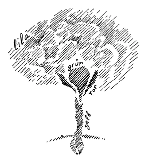 Machen wir uns einmal klar, worauf denn das Pflanzliche beruht. Ich habe ja das schon öfter angedeutet. Wir stellen uns die Erdoberfläche vor. Die Pflanze wächst aus der Erdoberfläche heraus. Wir wissen, die Pflanze hat ihre physische Organisation. Sie ist von ihrem Ätherleib durchdrungen. Aber die Pflanze würde sich nicht entfalten können, wenn sie nicht, wie ich das öfter schon dargestellt habe, von oben herunter zur Blüte hin berührt würde von dem astralischen Elemente, das überall ausgebreitet ist (siehe Zeichnung, lila). Die Pflanze hat nicht einen astralischen Leib in sich, aber das Astralische berührt überall die Pflanze. Die Pflanze nimmt in der Regel das Astralische nicht in sich auf, sie läßt sich nur berührt werden davon. Sie verarbeitet in sich das Astralische nicht. Sie lebt nur in einer Wechselwirkung; nach oben, nach dem Blühenden und Fruchtenden zu lebt sie in einer Wechselwirkung mit dem Astralischen. Das Astralische verbindet sich nicht mit dem Ätherleib oder mit dem physischen Leib der Pflanze, in der Regel.