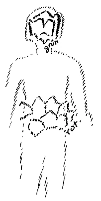Belladonna, for example, has a very similar effect on people. Belladonna works in such a way that the following occurs. I would like to draw it schematically. Through the consumption of Belladonna - which of course is not a “pleasure” - the etheric body is permeated by a strong framework. So if it is taken in an appropriate dose, so that the human being can tolerate it - but one can only be healed by a medicine if one can tolerate it - a strong framework is built into the etheric body of the abdomen, so to speak. This strong framework correctly produces its negative in the head. And it is on this interaction of the positive and negative that the healing process is based on which one counts on Belladonna.