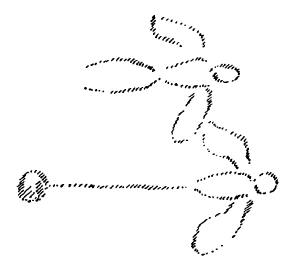 Once you enter the spiritual realm, there is no need for such a visible stalk. And when you come to certain elemental beings in the elemental world - you know, I spoke of the elemental kingdoms the other day - you see, for example, some being, then there is nothing there, far away is something else, and only gradually do you realize that they belong together; where one goes, the other goes. So that you end up in the very strange situation - in the elemental world it can be like this - where you have somewhere a piece of an elemental-etheric organism, and here the other piece, now a next state (see drawing below) for example like this: it has turned around, but there is not a stalk or anything like that and it is not so that when the one piece turns around, the other could simply walk directly along, but it has to make the path that the other has made.
