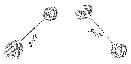 Sobald man ins Geistige hineinkommt, braucht es gar keines so sichtbaren Stieles. Und wenn Sie zu gewissen Elementarwesen in der elementarischen Welt kommen — Sie wissen, ich habe ja neulich von den Elementarreichen gesprochen -, da sehen Sie zum Beispiel irgendein Wesen, dann ist nichts da, weit weg ist etwas anderes, und nach und nach kommen Sie erst darauf: die gehören zusammen; wo das eine hingeht, geht das andere hin. So daß Sie also da in die ganz merkwürdige Lage kommen - in der elementarischen Welt kann es so sein —, da haben Sie irgendwo ein Stück eines elementar-ätherischen Organismus, und hier das andere Stück, jetzt einen nächsten Zustand (siehe Zeichnung unten) zum Beispiel so: der hat sich umgedreht, aber da ist nicht ein Stiel oder ähnliches und das ist nicht etwa so, daß wenn das eine Stück sich umdreht, das andere einfach direkt daherlaufen könnte, sondern es muß den Weg machen, den das andere gemacht hat.