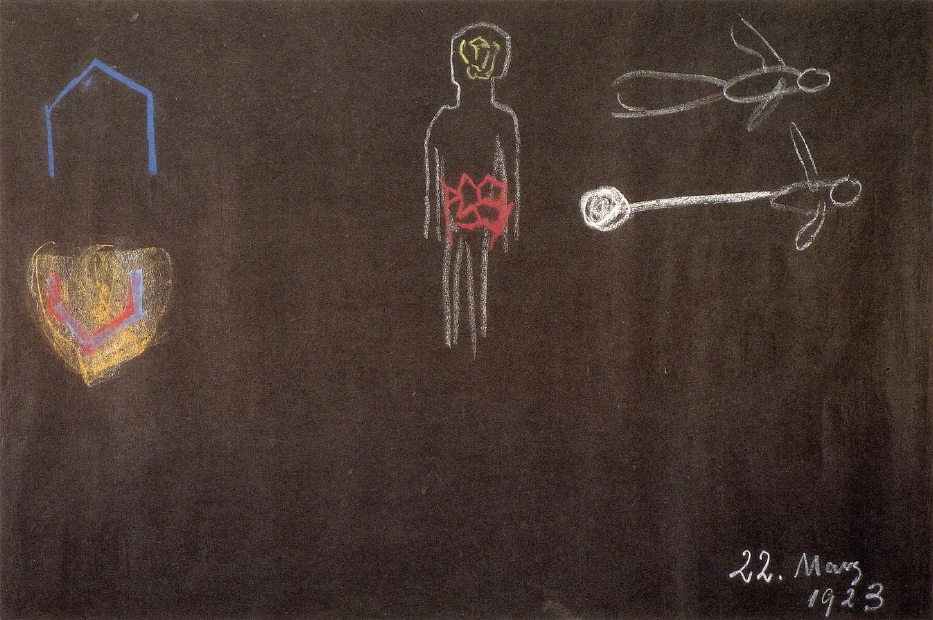 You just have to realize that when you get to such effects, you no longer need the spatial distribution. Today's man, with his dead but massive mind, can only think that if something is going on in his stomach, it can only come into the brain by visibly flowing upwards. But this is not the case; instead, processes of the abdomen evoke processes of the head as their counter-image, without there being any spatial distribution. If one is able to observe the etheric body, one can certainly see how it becomes bright in the etheric body of the lower body, shining brightly in a regular form (red), how it becomes dark in the head (green), but the form is reproduced as a negative, without there being a spatial-physical distribution.