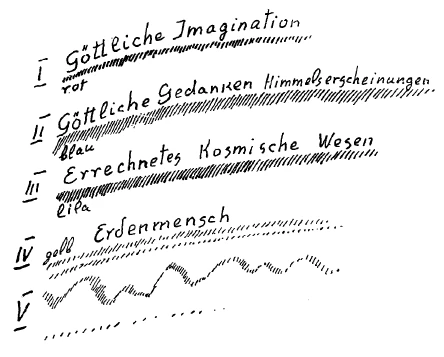 One must have a feeling for the reason why such mythology could be evolved for the first time in the Greek period, after the connection of man's own soul with super-earthly phenomena had been lost. In the first post-Atlantean epoch man felt himself to be the product of divine Imagination which he conceived as being present in the sphere of soul and spirit (diagram). Later he felt himself to be the product of divine Thoughts manifesting in the phenomena of the heavens, in wind and weather, and so forth. Then he gradually lost the consciousness which once led him into the cosmic expanse but had narrowed more and more into the confines of the Earth. Then came the Egypto-Chaldean epoch, when through calculation man was recognized as a cosmic being. And then came the fourth epoch, the Graeco-Latin epoch, when man became wholly a citizen of the Earth.