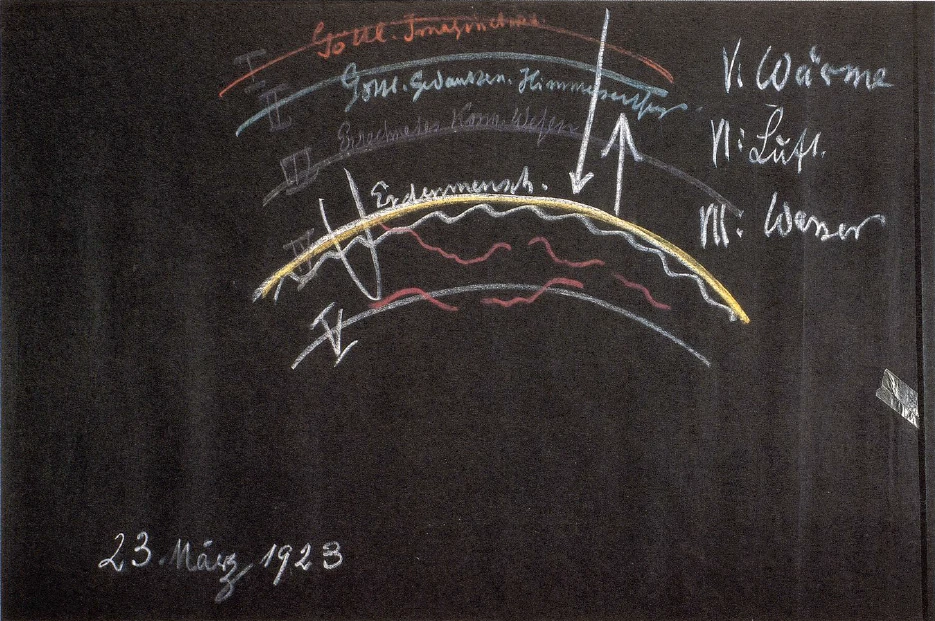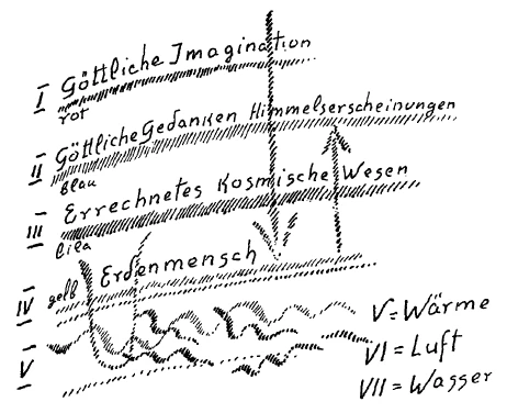 But then comes the sixth post-Atlantean period. If mankind were not converted by then from intellectualism to imagination, then the corruption would begin not only of the heat atmosphere, but of the air atmosphere, and men would poison the air with mere intellectualistic thoughts. And the poisoned air would have an effect back on the earth, that is, it would first spoil the vegetation (see drawing on page 123).