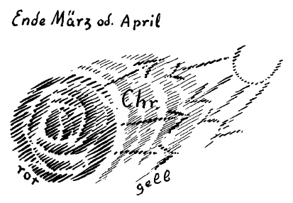 The Earth (red) has just breathed out; the soul is still half within the Earth, but the Earth has breathed it out; the streaming soul-forces are pouring out into the cosmos. Whereas since December, the force of the Christ Impulse has been intimately bound up with the Earth, with the soul-element of the Earth, we find that now this Christ Impulse, together with the outward-streaming soul element, is beginning to radiate around the Earth (arrows). This which here as Christ-permeated Earth-soul is flowing out into spiritual cosmic space, must be met now by the force of the sunlight itself. And the mental picture arises: While in December the Christ withdrew the Earth-soul element into the interior of the Earth, in order to be insulated from cosmic influences, now with the out-breathing of the Earth, He begins to let His forces breathe out, to extend them to receive the forces of the Sun (das Sonnenhafte) which radiate toward Him. And our schematic drawing will be correct if we represent the Sun force (yellow) as uniting with the Christ force radiating from the Earth. The Christ begins to work together with the Sun forces at Easter time; hence Easter falls at the time of the out-breathing of the Earth. But what happens then must not be related to the light flowing back from the Moon; it must be related to the Sun.