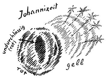 Let us now follow the earth further in the course of the year. Let us follow the earth up to the time in which we are now standing. Let us follow the earth approximately up to the time of the spring solstice, up to the end of March. We have to draw it schematically like this: The earth (see diagram on page 17, red) has just exhaled; the soul is still half in the earth, but the earth has exhaled the soul, the flooding soul forces of the earth are pouring out into the cosmos. If the power of the Christ impulse has been intimately connected with the earth since December, with the soul of the earth, then we now find how this Christ impulse begins to radiate around the earth (arrows) with the flooding soul. That which flows out into the spiritual cosmic space as the earth's soul, however, must now be met by the power of the sunlight itself. And the idea arises: Now the Christ, who has withdrawn with the earth in December into the interior of the earth in order to be isolated from the cosmic influences, begins to let his forces breathe out with the exhalation of the earth itself, to reach out to receive the sunlike that radiates towards him. And we obtain a correct schematic drawing if we now draw the solar nature as that which unites with the Christ power radiating from the earth (yellow):