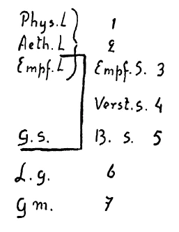 Als ich mein Buch «Theosophie» schrieb, da konnte ich nicht einfach aneinanderreihen: physischer Leib, ätherischer Leib, astralischer Leib und Ich, wie man es zusammenfassen kann, wenn die Sache schon da ist, wenn man die Sache innerlich durchschaut. Da mußte ich nach der Dreizahl anordnen: physischer Leib, Ätherleib, Empfindungsleib; erste Dreiheit. Dann die damit verwobene Dreiheit: Empfindungsseele, Verstandesseele, Bewußtseinsseele; dann die damit verwobene Dreiheit: Geistselbst, Lebensgeist, Geistesmensch, drei mal drei, ineinander verwoben (siehe Schema), dadurch wird es zu sieben. Aber die Sieben ist eben drei mal drei ineinander verwoben. Und nur, wenn man auf das gegenwärtige Stadium der Menschheitsentwickelung blickt, kommt die Vier heraus, die eigentlich im Grunde genommen eine sekundäre Zahl ist.