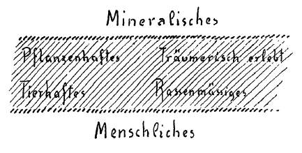 The great teachers of the Mysteries accepted this as a fact. I will show you what they thought by means of a graphic drawing. They said: "People have a dreamlike consciousness; this enables them to perceive the plant life in their surroundings clearly. - Through their dream images these people lived the plant life, but this dream consciousness did not reach as far as the perception of the mineral. So that the Mystery Teachers said to themselves: On the one hand, human consciousness goes to the plant-like (see diagram), which is experienced dreamily, but not as far as the mineral; that lies outside human consciousness. And on the other side, man feels within himself that which still connects him with animality, the racial, the animal-like (see diagram). On the other hand, that which actually makes man human through his upright form, through the spatial form of his being, lies outside of human consciousness.