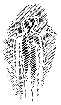 Wenn man die menschliche Gestalt nimmt, so kann man sagen: In sehr alten Zeiten hat der Mensch sich innerhalb dieser Gestalt so gefühlt, daß er nur das Äußerlich-Rassenhafte, das im Blute liegt, fühlte, daß er nicht bis zu der Haut hin empfunden hat (siehe Zeichnung, rot); er war nicht aufmerksam auf die Grenze. Heute ist der Mensch so weit, daß er auf die Umgrenzung aufmerksam ist. Er empfindet die Umgrenzung als das eigentlich Menschliche an seiner Gestalt. Aber der Mensch muß nun über sich hinauskommen. Er muß das Ätherisch-Astralische außer sich kennenlernen (blau). Das kann er eben durch geisteswissenschaftliche Vertiefung.
