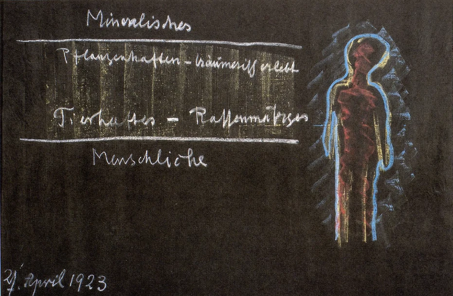 Today man has come so far that he does notice his outline, his bodily limits. He perceives his contour indeed as the typically human feature of his form (blue). Now, however, man must come out beyond himself; he must learn to know the etheric and astral elements outside himself. This he can do only through the deepening of spiritual science.