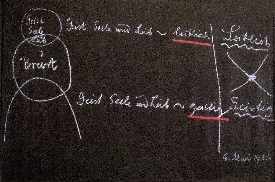 Deshalb aber ist das Haupt des Menschen gegenüber dem Kosmos etwas außerordentlich Vollkommenes. Das Haupt des Menschen enthält eigentlich materiell das Abbild des Geistes, der Seele und des Leibes des Menschen. Wenn man also das Haupt ins Auge faßt, so hat man da auf materielle Art, indem sie in der gestalteten Materie erscheinen, zusammenwirkend Geist, Seele und Leib. Man könnte sagen: Für das Haupt des Menschen ist Geist, Seele und Leib noch leiblich. Sehen Sie, das ist das Geheimnis des menschlichen Hauptes, daß auf leibliche Art da der Geist auftritt, daß wir an dem Wunderbau des Gehirns materiell aufzeigen können: dieser Wunderbau ist ein Bild des Geistes. Wie der Siegellack das ausdrückt, was auf dem Petschaft ist, so haben wir durch das Haupt materiell Geist, Seele und Leib gegeben.