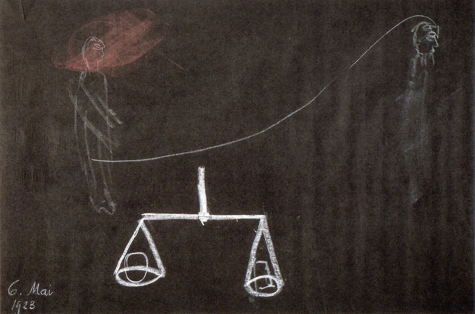 Let us try to understand the significance of this point, which must therefore lie in the middle man, in the chest man. Imagine you have a scale here. Imagine a load here, and weights on the other side; now you create a balance. I must not give an excess weight here, otherwise it will go down; I must not give an excess weight there either, otherwise it will go down; I must not take anything away either, otherwise the whole thing will move. But look, here is a point, a neutral point. You could add as much as you wanted to this point, nothing would change in the balance of the scales. You could also take the scales there, and if you avoid creating an excess weight somewhere by any swing or something like that, you can move the scales all around, the balance remains the same. You can carry out the weighing correctly during the movement. This is a point that is not at all concerned with the whole system of the scales, an equilibrium point. You can do whatever you want with it, and nothing will change for the rest of the balance. For example, someone has a load on one side and weights on the other. Now he realizes: the balance beam is made of iron, I don't like that, I'll make it out of gold. Now all he has to do is enlarge the center point a little, because actually the point of rest is a mathematical point, but it will be possible to enlarge it a little. You can bring gold into this point of rest quite well: the balance will not be changed. If you put the gold somewhere else – outside the center – then the balance will change immediately. But if someone wants to create a hollow space there and put flesh in it, they can do that too, it won't change the balance. Another person puts butter in there: the butter melts in the sun, the balance of the scales does not change. In short, there is a point here, quite independent of the whole system of the scales, where you can do whatever you want.