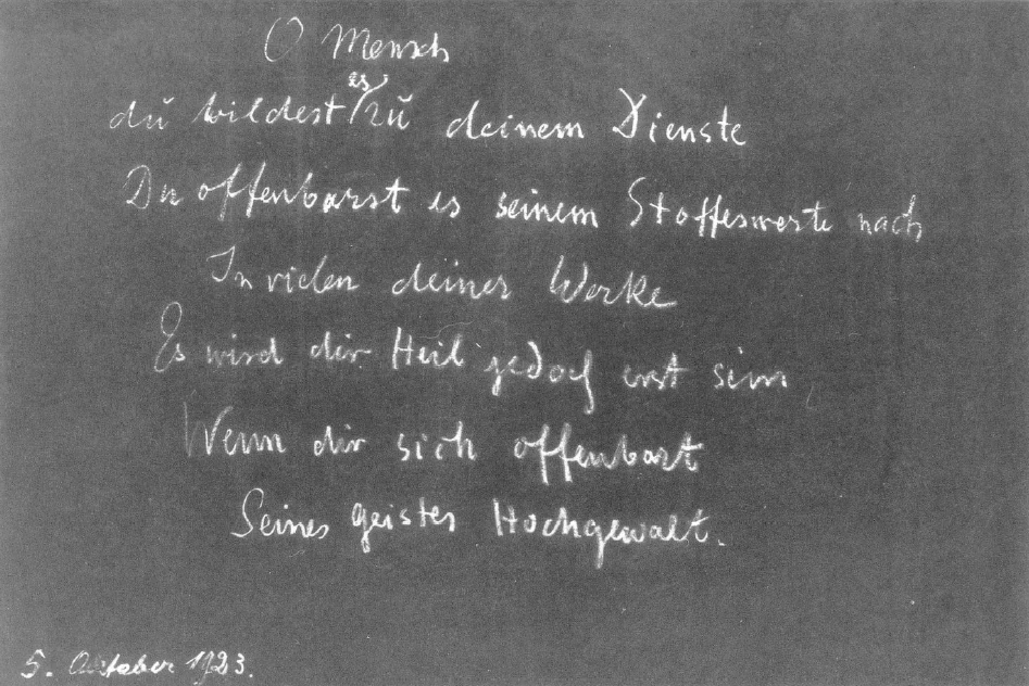 Und so kann man gerade jetzt in dieser Zeit, übrigens schon seit Jahrzehnten, aber besonders stark in dieser Zeit schwerer Menschenprüfungen, im astralischen Lichte, wenn man geistig im Geisterlande dahinwandelt, einen bemerkenswerten Spruch lesen. Es sieht einem prosaischen Vergleich ähnlich, aber durch die innere Bedeutung wird in diesem Falle ja das Prosaische nicht prosaisch bleiben. Wie man eben solche Tafeln, nach denen man seine Wege verfolgen kann, findet, wie auch da oder dort in poetischeren Gegenden das oder jenes auf Richttafeln zu finden ist, so treten einem bedeutsame geistige Richttafeln im Astrallichte entgegen. Ich möchte sagen: Immer wieder, in gleicher Wiederholung immer wieder findet man eben den folgenden Spruch, der da eingeschrieben ist mit ganz bedeutsamer geistiger Schrift in das Astrallicht in der heutigen Zeit: