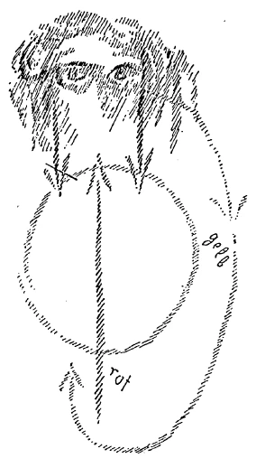 Von der Wesenheit, die man so beschreiben muß — man kann sie nicht anders beschreiben -, von dieser Wesenheit gehen Kräfte aus, die nun aber im Menschen wirken, aber auf eine eigentümliche Art im Menschen weiterwirken. Dasjenige, was ich Ihnen schildere, geht zur Hochsommerzeit vor sich. Wir müssen uns nun vorstellen, daß diese Wesenheit des Uriel nicht eigentlich ruht, sondern in einer majestätischen Bewegung ist. Und das muß sie ja sein, denn wenn bei uns Sommer ist, dann ist auf der abgewandten Halbkugel der Erde Winter, und wenn bei uns Winter sein wird, dann ist auf der abgewandten Halbkugel Sommer; dann ist der Uriel dort für die Höhen. Und wir müssen uns eigentlich vorstellen, daß, wenn wir hier die Erde haben (siehe Zeichnung Seite 73), hier für uns, für unsere Sommerzeit, Uriel erscheint und dieser Uriel eine Bewegung vollführt, die ihn nach einem halben Jahre auf die andere Seite bringt: da haben wir dann Winter. Während Uriel absteigt (gelber Pfeil), während also seine Kräfte in absteigender Linie zu uns kommen, verwandelt sich für uns der Sommer in den Winter: wir sind hier im Winter, Uriel ist auf der andern Seite. Aber die Erde ist kein Hindernis dafür, daß die Kräfte des Uriel zu uns kommen. Wenn Uriel für die Bewohner der andern Halbkugel da unten ist, dann dringen seine Kräfte durch die Erde zu uns. So daß wir sagen können: Dasjenige, was auf direktem Wege von oben nach unten von Uriel zu uns dringt (rote Pfeile) und uns mit sommerlichem Sonnengold durchdringen will, das wirkt zur Winterzeit durch die Erde hindurch und durchdtingt uns von der andern Seite; da ist es in aufsteigender Linie, da hat es eine aufsteigende Strömung (rot).