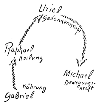 And just as Gabriel passes on to Raphael the nutritive forces, to be transmuted into forces of healing—in other words, he passes on his golden vessel—and just as Raphael passes on his golden vessel to Uriel, whereby the healing forces are made into the forces of thought, so it is Michael who receives from Uriel the thought-forces, and through the power of cosmic iron, out of which his sword is forged, transforms these thought-forces into forces of will, so that in man they become the forces of movement.