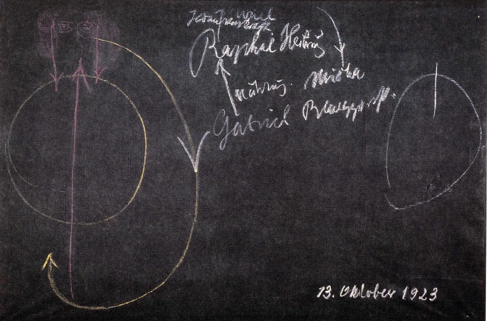 And just as Gabriel hands the nourishing powers to Raphael for transformation into healing powers, that is, his golden bucket, just as Raphael hands his golden bucket to Uriel by turning the healing powers into the powers of thought, so it is Michael who receives the powers of thought from Uriel and, by virtue of the cosmic iron from which his sword is forged, transforms these powers of thought into will, so that they become powers of movement in man. UÜtiel hands his bucket to Michael, and the powers of thought become powers of movement. So that we really also get this second picture: Uriel, Raphael, Gabriel, Michael, ascending and descending, working together, let us say, Uriel and Gabriel together, but also working together, one giving his possession to the other, so that he can continue to work in him. We see how heavenly forces ascend and descend and pass the golden buckets to each other, the golden buckets of the nourishing, the healing, the thoughtful, the moving. Thus these golden buckets move from one to the other, while at the same time one interacts with the other in world harmony.
