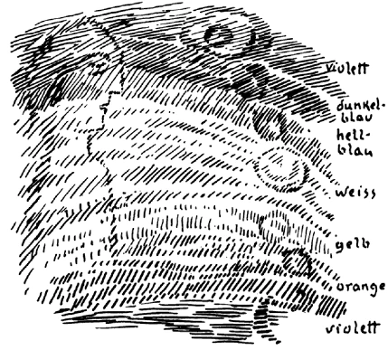 Wenn wir nun die Organisation des Adlers ins Auge fassen, dann haben wir vor allen Dingen darauf zu sehen, inwiefern dieSonnenkräfte modifiziert werden, verstärkt oder geschwächt werden durch das Zusammenwirken der Sonne mit Saturn, Jupiter, Mars. Nicht umsonst spricht die Legende davon, daß der Adler eigentlich Jupiters Vogel ist. Der Jupiter steht überhaupt da als Repräsentant für die äußeren Planeten. Wenn wir uns schematisch das hinzeichnen, um was es sich dabei handelt, dann müssen wir uns hinzeichnen die Sphäre, die im Weltenraum, im Kosmos der Saturn hat, die Sphäre, die der Jupiter hat, die Sphäre, die der Mars hat.