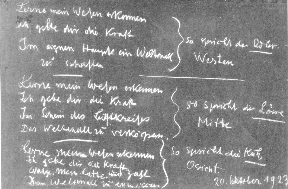 If you feel what I want to say with this Europeanization of the old Negro fable, then you will understand that today these things should actually be understood correctly. They will only be understood correctly if man learns to counter the threefold call, that of the eagle, that of the lion, that of the cow, with his saying, the saying which today should be the shibboleth of human power and thought and action: