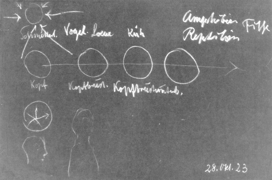 In der Erdenzeit, wenn der Mensch sich seine Gliedmaßen ausbildet unter der Schwere und dem Erdmagnetismus, da strecken allerdings auch — meinetwillen nehmen wir die Schildkröte als Repräsentanten die Schildkröten ihren Kopf heraus über ihren Panzer mehr wie ein Gliedmaßenorgan als einen Kopf. So können wir auch verstehen, wie bei den Amphibien und Reptilien dieser Kopf ungeschlacht gestaltet ist. Er ist eigentlich wirklich so gestaltet, daß man durchaus das Gefühl hat, wie es auch richtig ist: da kommt man aus dem Mund sogleich in den Magen hinein. Da ist nicht viel Vermittelung.