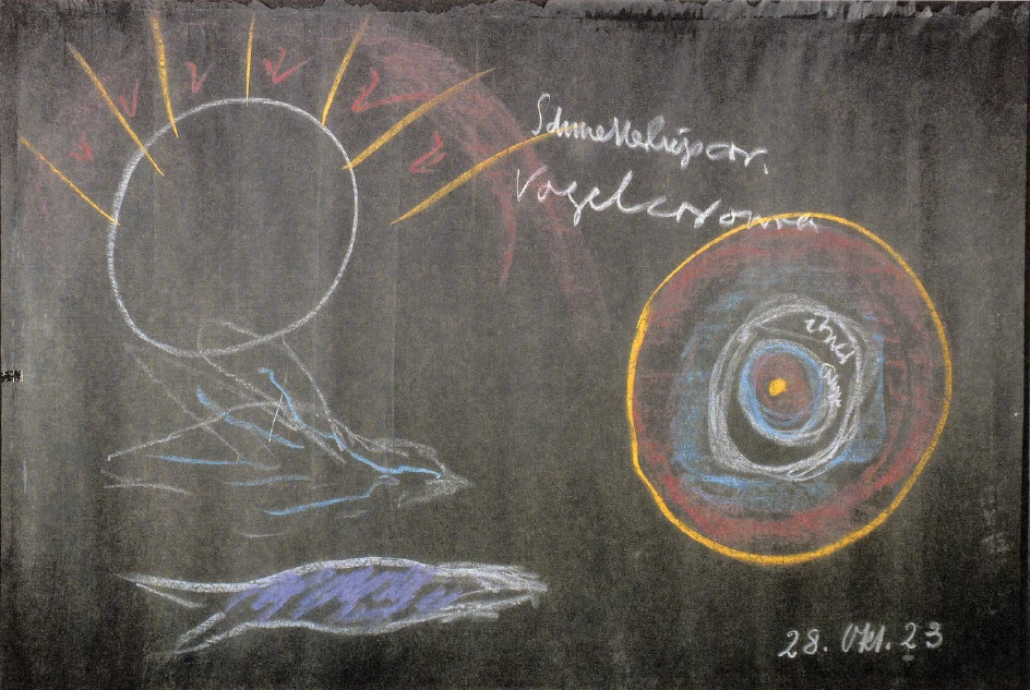 Therefore you will also find it understandable if, returning to something I have already said, I once again draw the following for you. I told you that the butterfly, which is actually a being of light, continually sends the spiritualized earth matter out into the cosmos throughout its life. I would now like to call this spiritualized earth matter, which is sent out into the cosmos, the butterfly corona, using a common term in solar physics. Thus the butterfly corona continually radiates out into the cosmos. But into this butterfly corona radiates that which the bird's sex hands over to the cosmos every time the bird dies, so that the spiritualized matter of the bird's sex radiates into it, out into the cosmos. From the outside, spiritually seen, one then has the sight of a glowing corona, starting from the butterfly gender - according to certain laws this is also preserved in winter - and more radiantly placed into it, which flows out from the birds.