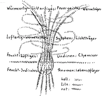 By the fact that the sylph carries the light into the plant, something quite peculiar is created in the plant. You see, the sylph continually carries the light into the plant. The light, that is, the sylphic force in the plant, acts on the chemical forces that the undine transports into the plant. This is where the interaction of sylph light and undine chemistry takes place (plate 11, top left / drawing p. 114, red). This is a strange plastic activity. Out of the light, the sylphs weave an ideal plant form with the help of the substances that flow up there and are processed by the undines. The sylphs actually weave the original plant in the plant from the light and from the chemical work of the undines. And when the plant withers towards autumn and everything that is physical matter withers away, then these forms of the plants just come to trickle down, and the gnomes now perceive them, perceive what the world, the sun through the sylphs, the air through the undines, has done to the plant. The gnomes perceive this. So that the gnomes below are busy all winter long perceiving what trickles down from the plants into the ground. There they grasp the ideas of the world in the plant forms, which are plastically formed with the help of the sylphs, and which go into the ground in their spirit-idea form.