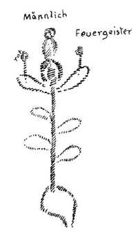Here above (see drawing $. 121) the plant, having passed through the sylphic realm, enters the sphere of the elemental fire spirits. And the fire spirits, they are the inhabitants of the warmth-like-light-like; they now collect the warmth when the heat of the earth has risen to its highest or has just become suitable. Just as the sylphs have gathered the light, so the fire spirits gather the warmth and carry it into the blossoms of the plants.