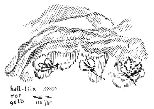 These root spirits, which are present everywhere in the earth, which feel particularly comfortable within the more or less transparent or also metallically interspersed rocks and ores, but which feel most comfortable because that is their actual place when it is a matter of imparting the mineral substance to the plant root, these root spirits are completely filled with an inner spirituality that we can only compare with what we can grasp in the inner spirituality of the human eye, the human ear. For these root spirits are completely sensual in their spirituality. They are actually nothing else than sense, they are entirely sense, and a sense that is at the same time understanding, that not only sees and not only hears, that immediately understands what it sees and hears, that not only receives impressions everywhere, but receives ideas everywhere. - Yes, we can also point to the way in which these root spirits receive their ideas. You see, the plant sprouts out of the earth (plate 11, top left / drawing p. 114). As I will show later, the plant comes into contact with the extraterrestrial universe, and at certain times of the year in particular, streams of spirits (purple) flow from above, from the blossom, from the fruit of the plant down to the root, flowing into the earth. And just as we stretch our eyes towards the light and see, so the root spirits turn their perceptive faculties towards that which trickles down through the plants from above into the earth. What trickles towards them is what the light has sent into the flowers, what the warmth of the sun has sent into the plants, what the air has done in the leaves, indeed, what distant stars have done in the formation of the plants. The plant collects the secrets of the universe, sinks them into the soil, and the gnomes absorb these secrets of the universe from what is spiritually instilled into them by the plant. And by carrying, especially from autumn through the winter, on their wanderings through ore and rock, what is instilled into them through the plants, they become those beings within the earth who carry the ideas of the whole universe wandering through the earth. We look out into the wide world. The world is built from the world spirit, an embodiment of the world ideas, the world spirit. The gnomes absorb the ideas of the universe through the plants, which are to them what the rays of light are to us, and carry them within the earth in full consciousness from ore to ore, from stone to stone.
