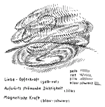 So sehen wir von unten herauf, ich möchte sagen, im BläulichSchwärzlichen die Schwerkraft (Tafel 12 / Zeichnung S. 126), der der Schwung nach oben hin gegeben wird, von den Gnomen ausgehend, und, rings die Pflanze umschwirrend, angedeutet in den Blättern, die Undinenkraft, welche Stoffe mischt und entmischt, indem die Pflanze hinaufwächst. Von oben herunter, von den Sylphengeistern wird hineingeprägt in die Pflanze das Licht, die nun eine plastische Gestalt bilden, die wiederum idealisiert hinuntergeht und vom Mutterschoße der Erde aufgenommen wird. Und dann wiederum wird die Pflanze umschwirrt von den Feuergeistern, die in den kleinen Samenpünktchen konzentrieren die Weltenwärme, die dann mit der Samenkraft den Gnomen hinuntergegeben wird, so daß die Gnomen aus Feuer und Leben da unten die Pflanzen entstehen lassen können.