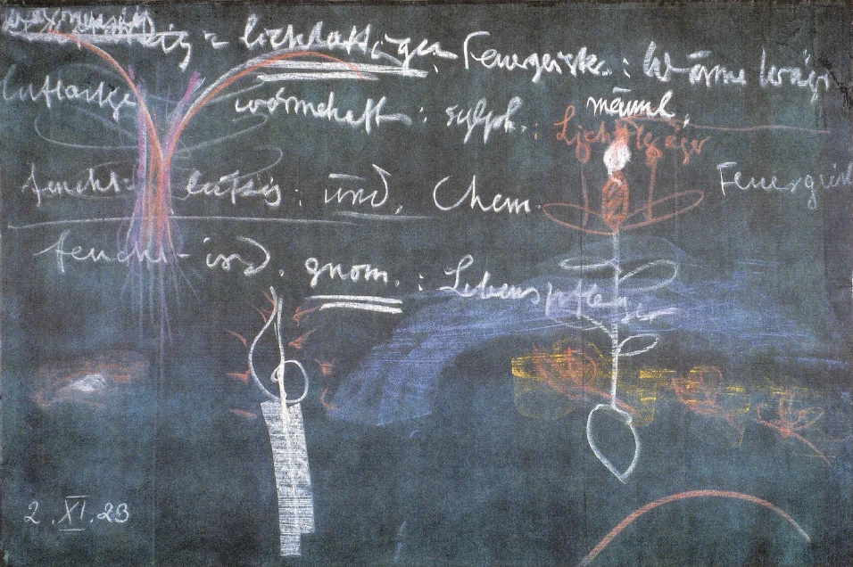 So we see from below, I would like to say, in the bluish-black, the force of gravity (plate 12 / drawing p. 126), which is given the impetus upwards, starting from the gnomes, and, whirling around the plant, indicated in the leaves, the undine force, which mixes and unmixes substances as the plant grows upwards. From above, from the sylph spirits, the light is imprinted into the plant, which now forms a plastic shape, which in turn descends idealized and is absorbed by the womb of the earth. And then again the plant is surrounded by the fire spirits, who concentrate the world heat in the small seed dots, which is then given down to the gnomes with the seed power, so that the gnomes can create the plants from fire and life down there.