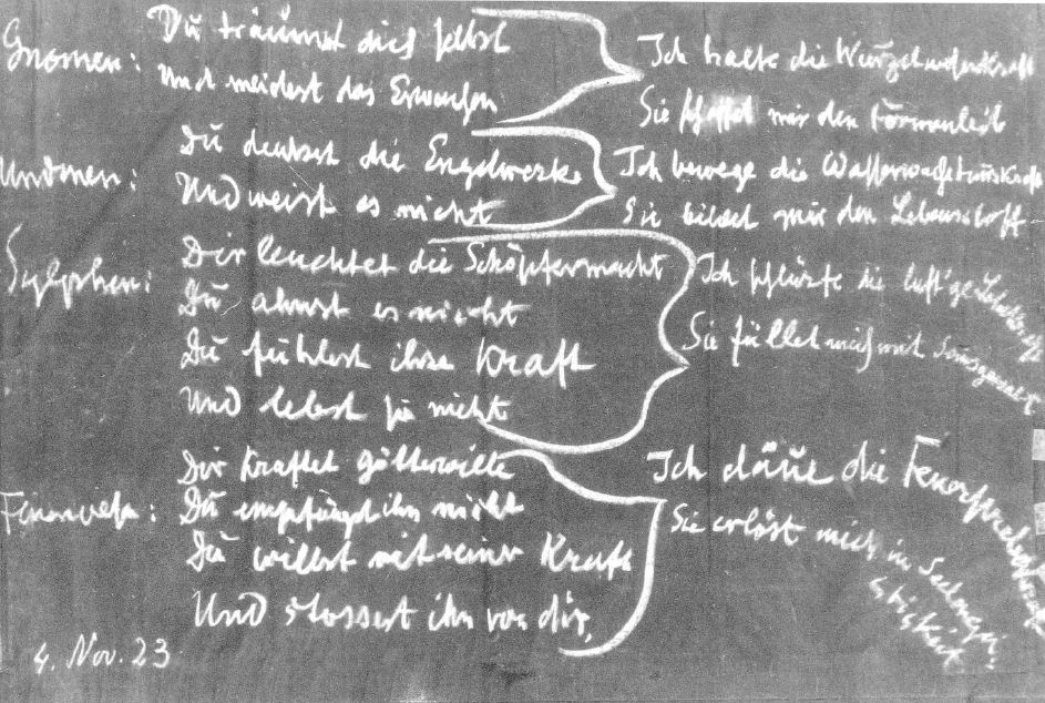 Now, therefore, I can try to give you an idea of what these beings—gnomes, undines, sylphs and fire-beings—mean with their buzzing about, of what happens when we begin to hear what amuses them in us, and of what they would have us do when they admonish us to give a forward impetus to our consciousness. Yes, you see, here come the gnomes and speak somewhat as follows: