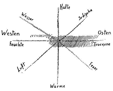 Aristotle awakened in Alexander all that Gilgamesh had passed through when he undertook the journey over to the West. And the result of it was that his pupil could perceive in direct inner experience what is felt in the direction of North-West, in the intermediate zone between Moist and Cold:—Water. A man like Alexander not merely could, but did actually speak in such a manner as not to say: There goes the road to the North-West—but instead: There goes the road to where the element of Water holds dominion. In the intermediate zone between Moist and Warm lies the element where the Air holds dominion.