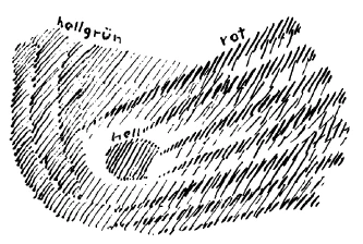 Daher fühlten solche Menschen, die nun wirklich jenes große Erlebnis hatten, das man skizzenhaft ganz einfach darstellen kann (siehe Zeichnung): Der Mensch kommt an die Erde heran aus dem Weltenall (gelb). Die Zahl kommt ja nicht in Betracht, da, wie ich schon gestern sagte, die Menschen ineinanderstaken. Er sondert alles Pflanzliche ab, und die Erde nimmt das Pflanzliche auf und gibt ihm das Wurzelhafte (dunkelgrüne Striche). - So fühlte der Mensch, wie wenn er mit dem Pflanzenwachstum gewissermaßen die Erde umschlungen hätte (rote Umhüllung) und wie wenn die Erde dankbar gewesen wäre für dieses Umschlungenwerden und aufgenommen hat dasjenige, was ihr der Mensch an wäßtig-luftigen Pflanzenelementen zuhauchen konnte. Und diejenigen, die solches fühlten, die fühlten sich in bezug auf dieses Pflanzenbringen zur Erde als innig verwandt mit dem Gotte, mit dem Hauptgotte des Merkur. Durch diese Empfindung, man habe selber die Pflanzen auf die Erde gebracht, kam man in eine besondere Beziehung zu dem Gotte Merkur.