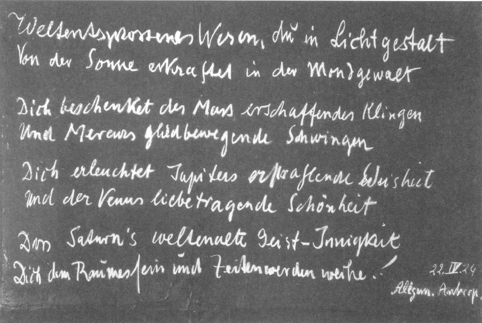 And now, when that moon world resounding was there again, in which it was recognized by Aristotle and Alexander what the fire of Ephesus meant, how this fire carried out into world ether distances that which was the secret of Ephesus, it was then that the inspiration arose in these two to found the world writing. Only, the world script is not founded with \(a b c d e f\), but the world script is founded, as the book script with letters, so this one with thoughts. And the letters of the world script were created.