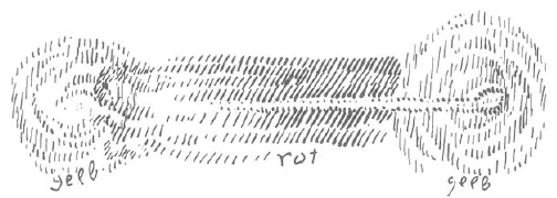 Erinnern Sie sich an das, was ich schon gesagt habe. Ich sagte Ihnen: da ist der Mensch in seiner gegenwärtigen Inkarnation. (Es wird gezeichnet, rechts Mitte.) Wenn er Imagination entwickelt, so schaut er seinen Ätherleib etwas vor die Geburt oder Empfängnis hingehend (gelb); aber sein astralischer Leib führt ihn durch Inspiration hinein in die ganze Zeit, die verflossen ist zwischen dem letzten Tode und dieser Geburt (rot). Und die Intuition führt ihn in das vorangehende Erdenleben zurück (gelb).