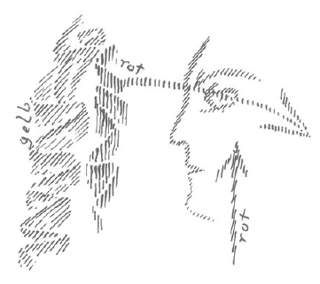 Das, was so vorstellt, ist schon das Musterbild eines verworrenen Denkens. Denn dieser ganze Glaube, daß der Erinnerungsgedanke da irgendwo sitzt, wo er hervorgeholt werden kann, entspricht gar nicht dem Tatbestand, der eigentlich auftritt. Vergleichen Sie nur einmal eine unmittelbare Wahrnehmung, die Sie haben und an die Sie einen Gedanken anknüpfen, damit, wie eine Erinnerungsvorstellung, ein Erinnerungsgedanke auftaucht. Sie unterscheiden das ja gar nicht. Sie haben draußen einen Sinneseindruck, daran schließt sich ein Gedanke. Das, was hinter dem Sinneseindruck ist, was den Gedanken hervorruft, das nennen Sie ja gewöhnlich auch ein Unbekanntes. Der Gedanke, der aus dem Inneren aufsteigt als Erinnerungsgedanke, der ist ja gar nicht anders als der Gedanke, der außen an der Wahrnehmung auftritt. Das eine Mal haben Sie, wenn Sie den Menschen, schematisch gezeichnet, hier haben, seine Umgebung hier (gelb); der Gedanke tritt von außen auf, tritt an der Umgebung auf (roter Pfeil von links). Das andere Mal kommt er von innen. Da ist er ein Erinnerungsgedanke (Pfeil von unten). Die Richtung, von wo er herkommt, ist eine andere.
