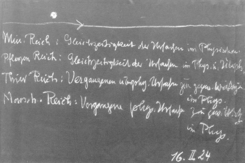 I will write down a scheme for this. We can say: mineral kingdom: simultaneity of the physical for causes and effects. So essentially we are dealing with simultaneity of causes in the physical. You will say: Yes, for some things that happen in the physical, the causes of time are earlier. - This is not really the case. If effects are to arise in the physical, the causes must persist, must continue to work. When the causes cease, no more effects occur. So we can certainly write down this dictum: Mineral kingdom: simultaneity of causes in the physical.