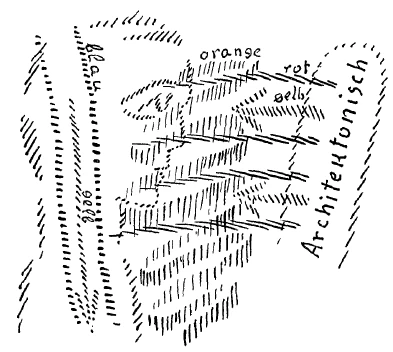 On the one hand, one descends into one's inner self, on the other hand, looking outwards, one encounters what is there in the architecture, in the temple architecture, in the church architecture. It all comes together in a strange way. There is a middle field (orange) between what lives inside and what the gaze is thrown back on here, which man does not see at all in ordinary consciousness, because he does not allow his outer gaze to be intercepted by a real, internalized architecture today, and because he does not allow his inner gaze to be intercepted by the imaginative, by the pictorial. But what lies in between: If you go around in life with this, if you go around with an inner knowledge deepened by imagination and with a sense healed by outer architectural forms that are now really built out of the human, then you will get the feeling that the older people had for the blows of fate. If you develop that which lies between these two, between the sense of the truly architectural and the sense of the truly symbolically inward, then you will find the receptivity for the blows of fate. What happens is perceived as coming over from earlier earthly lives. This is again the introduction to further karma observations, which will be made in the near future and which will also include “good and evil” in the karma observations. But you see, it is really a matter of real thinking in the anthroposophical movement. The architecture appropriate to today's modern man, which could intercept his gaze in the right way and which could have gradually brought his naturalistic view, which obscures and darkens his karma, into view, was out there in a certain form. And that within these forms, in turn, was spoken in anthroposophical discussions, that gave the inner vision. And among everything else that has already been emphasized, it was precisely this Goetheanum, this Goetheanum building with the way in which anthroposophy would have been practiced more and more in it, that was the education for karmic vision. This education for karmic vision must enter into modern civilization.