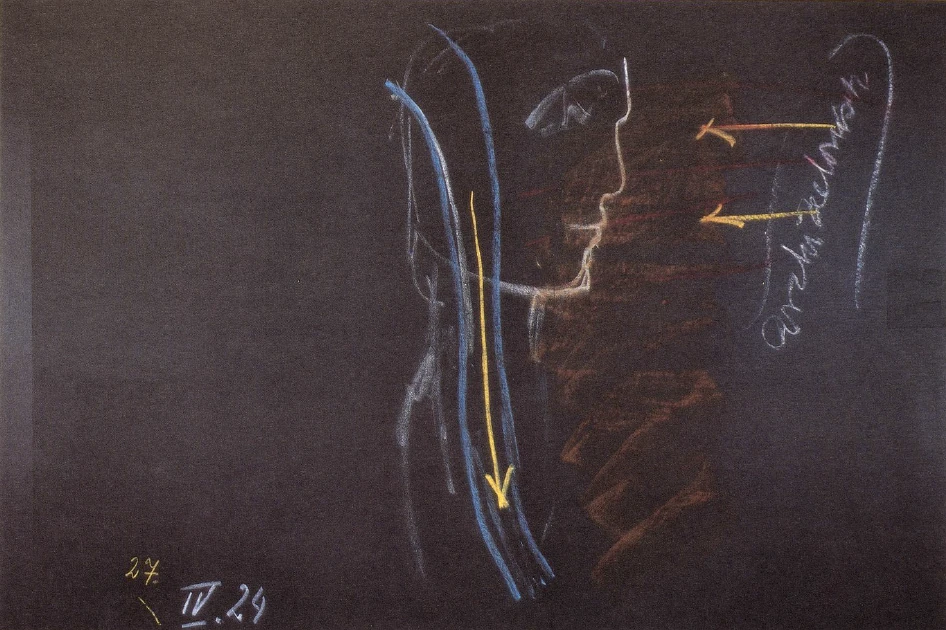 But it was also known how this emaciation is compensated for. One knew, when one looked at the temple architecture, at the evenness of the load-bearing and weight-bearing, or, as in the Orient, at the forms that actually represented the moral in external sculpture, when one looked at what was presented to the eye, to perception in general, in the forms of architecture, or what was then really presented musically in architecture, that therein lies the remedy for the emaciation of the senses when they merely look out into nature. And when the Greek was led into his temple, where he saw the supporting and weight-bearing elements, the columns, the architrave above them and so on, when he perceived the inner mechanics and dynamics that confronted him, then his gaze was closed. In nature, on the other hand, people stare outwards, their gaze actually goes into infinity and they never come to an end. You can actually do natural science for every problem without end: it goes on and on and on. But the view closes off when you have some real architectural work in front of you that aims to capture this view, to denaturalize it. You see, there you have the one thing that was there in the old days: this capturing of the outward gaze.
