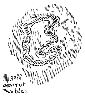Stellen Sie sich vor, der astralische Leib ist da draußen (siehe Zeichnung, gelb). Jetzt gestaltet er da draußen dieses Bild, das ich rot zeichnen will — es ist natürlich alles schematisch. Dieses Bild gestaltet er. Das alles geschieht im äußeren Äther; der äußere Äther, der inkrustiert gewissermaßen mit seiner eigenen Substanz dasjenige, was da im Astralleib als Bild geformt ist. Also der äußere Äther bildet hier überall die Ätherform (blau) als ein so scharf ins geistige Auge gefaßtes Bild.