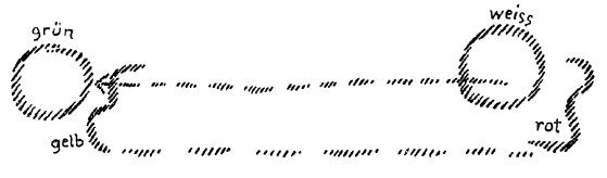 Man bekommt nicht die innere Stetigkeit im Verfolgen dessen, was in der Seele keimt und fruchtet, wenn man so eilen will von Neuem zu immer Neuerem, sondern es handelt sich wirklich darum, daß die Dinge reifen müssen in der Seele. Da muß man sich ganz abgewöhnen, was heute eigentlich in vieler Beziehung üblich ist. Da muß man sich gewöhnen an ein inneres aktives Arbeiten der Seele, an ein Arbeiten im Geiste. Das ist dasjenige, was einem dann hilft, um solche Dinge zustande zu bringen, wie ich sie gerade heute auseinandergesetzt habe, um überhaupt die innere Seelenverfassung nach dem dritten Tage für irgendein Erlebnis zu haben, das man karmisch durchschauen will. Und so muß man überhaupt vorgehen, wenn man Geistiges erkennen will. Man muß sich von vorneherein sagen: In dem ersten Momente, wo man an dieses Geistige irgendwie gedanklich herantritt, da ist ja erst der Anfang gemacht. Und will man da sogleich irgendein Resultat, ein Ergebnis haben, so ist das ganz unmöglich - man muß warten können. Nicht wahr, wenn ich heute ein Erlebnis habe, das karmisch verursacht ist in einem vorhergehenden Erdenleben, so können wir das schematisch so zeichnen: Das bin ich, das ist mein Erlebnis, das Erlebnis von heute (siehe Zeichnung, weiß, rot). Das dort ist verursacht von der ganz andersartigen Persönlichkeit mit demselben Ich in einem vorigen Erdenleben (grün, gelb). Da steht es. Da hat es längst aufgehört, meiner Persönlichkeit anzugehören, aber es ist eingetragen in die Ätherwelt, respektive in die astralische Welt, die hinter der Ätherwelt steht. Nun muß ich erst zurückgehen, den Weg zurückmachen.