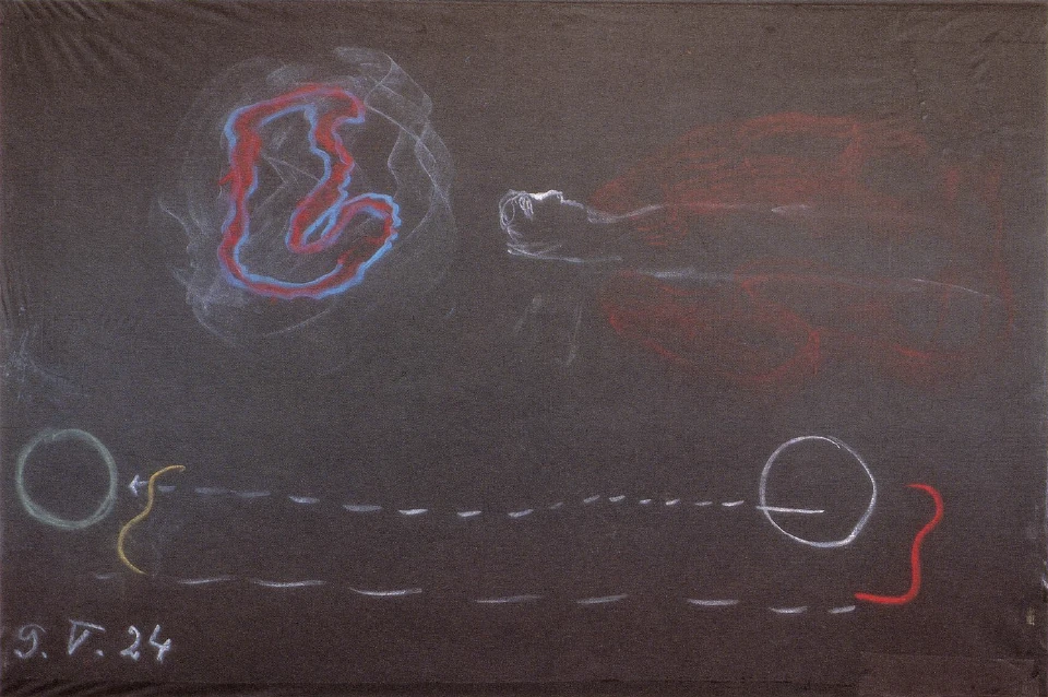 So this is the third day and the third night. With this image, which is completely transformed, you crawl out of bed on the fourth day. Enclosed in this cloud (see drawing, red), you get up. And if you actually formed the image with the necessary strength on the first day, if you were attentive to what your feeling gave you on the second day, you will now notice: Your will is in this present picture. The will is there, but this will cannot live itself out, it is bound. It really is like this, to put it in somewhat extreme terms, as if one had resolved - like an unbelievably bold speed runner who sets out to perform some bravura run -: I am running, I am now running down to Oberdornach, I am already imagining it, I have it in me. It is my will, but at that moment when I want to start, when the will is strongest, someone ties me up so that I stand there stiffly, so that the whole will is developed, but I cannot bring the will to execution. That is roughly the process.