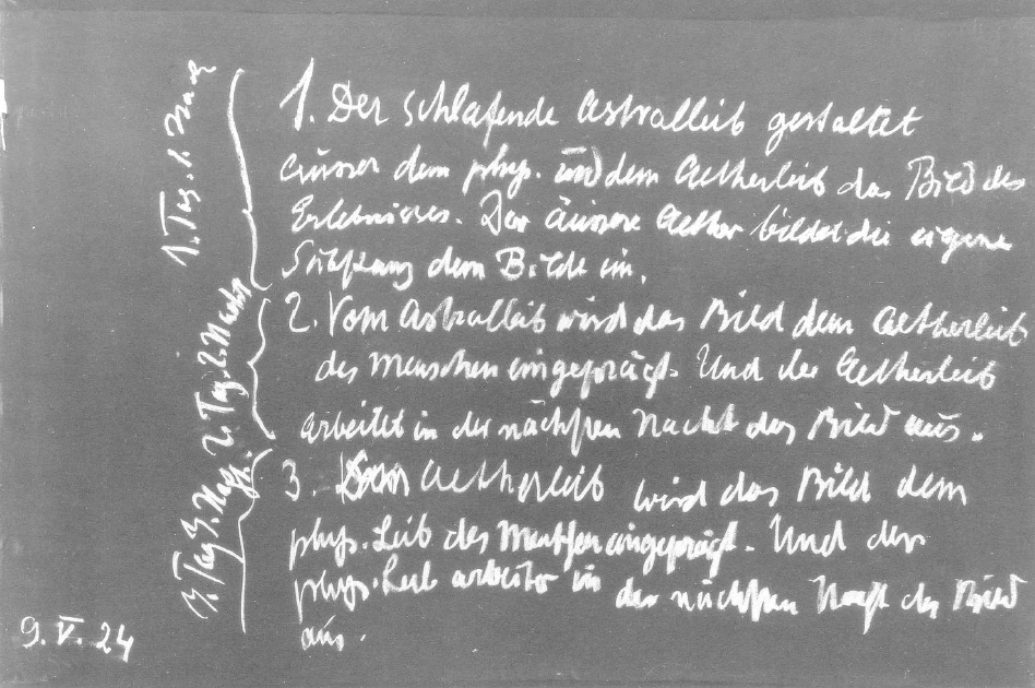 (1. Der schlafende Astralleib gestaltet außer dem physischen und dem Ätherleib das Bild des Erlebnisses. Der äußere Äther bildet die eigene Substanz dem Bilde ein.
